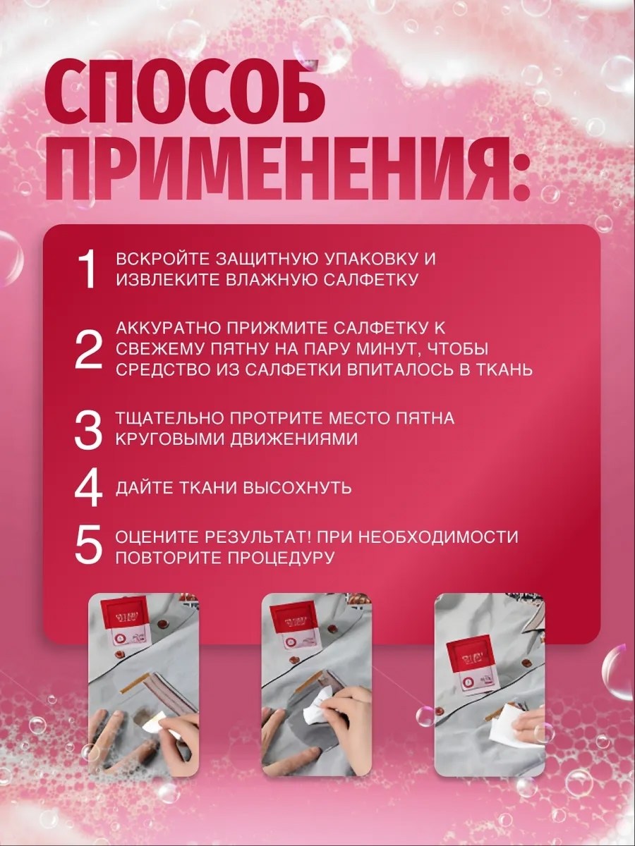Салфетки против пятен для одежды - это универсальный набор для домашней химчистки и удаления пятен В него входят влажные салфетки с мягким очищающим средством, которые мгновенно удаляют пятна с белого и цветного белья, мебели, ковров и даже мягкой мебели Эти маленькие, мини но мощные салфетки являются лучшим помощником в борьбе с пятнами от пота, жидкого макияжа и других загрязнений Они также подходят для удаления пятен с верхней одежды, куртки, с пуховиков и меховых изделий без необходимости стирки или химчистки Эти китайские моющие средства являются безопасными для чистки детских вещей и могут использоваться как одноразовые салфетки для мгновенного удаления от всех видов пятен С нашими салфетками для одежды вы сможете легко и быстро очистить свою одежду, не прибегая к стирке или химчистке.