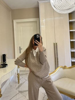 Теплый вязаный трикотажный костюм с широкими брюками и свитшотом.
