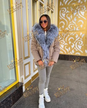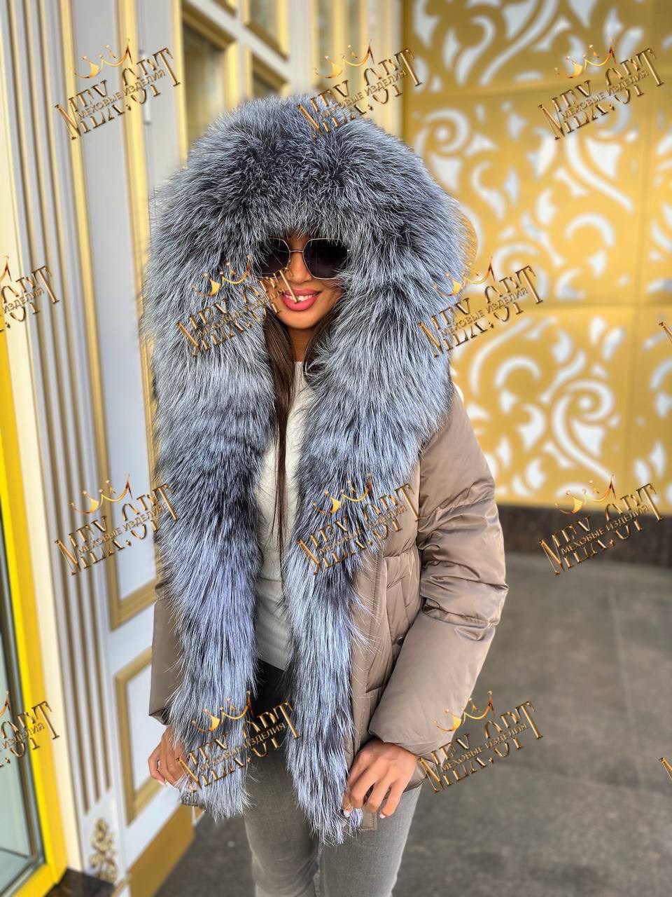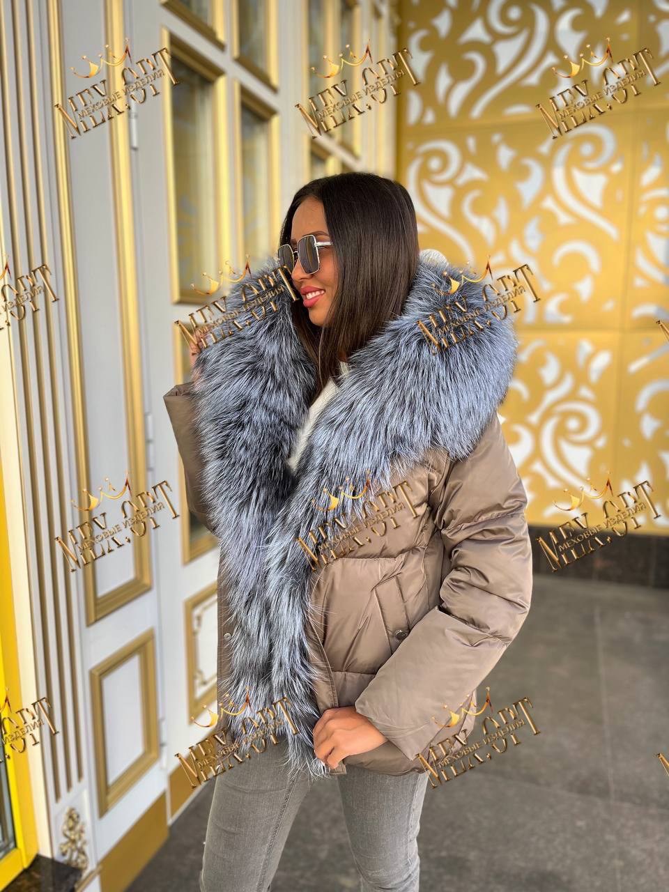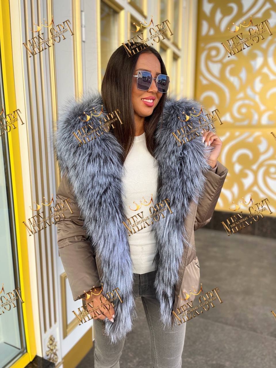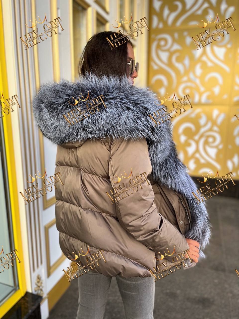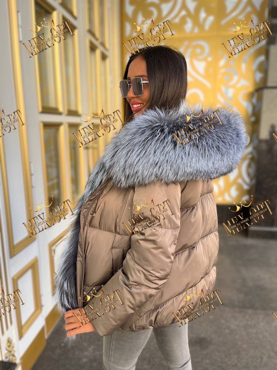 Пуховик с натуральным мехом чернобурки, длина 75 см.