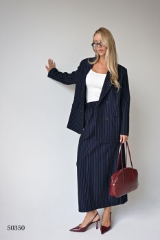 Стильный костюм, состоящий из пиджака и юбки в полоску Станет отличным выбором для классического гардероба.
