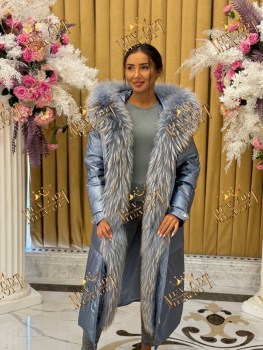 Пуховик с натуральным мехом енота, утеплен пухом, длина 115 см.