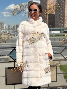 Шубка из меха норки, стойка воротник, длина 100 см, цвет пудра.
