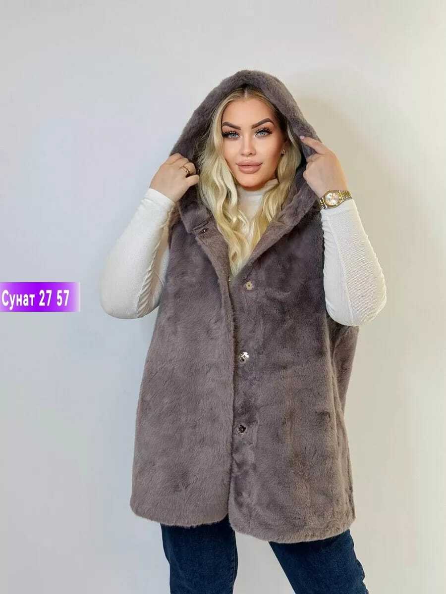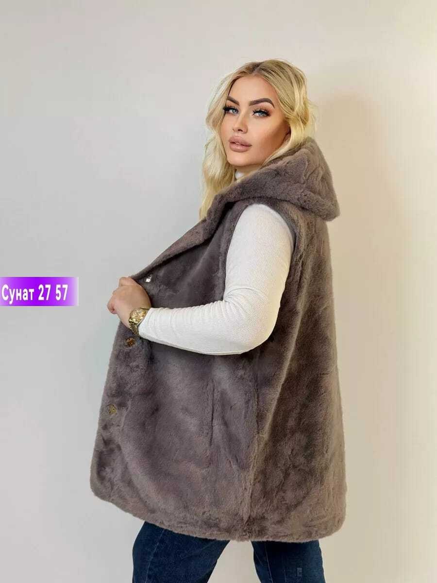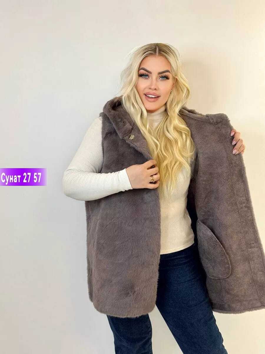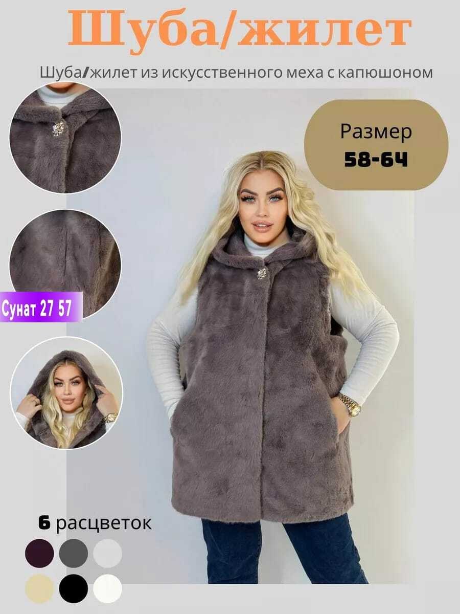 Шуба/жилет из искусственного меха с капюшономтолько жилет, без внутреннего пуховика Длина изделия по спинке - 85см Размеры 58 60 62 64 66 68цена 1500р.