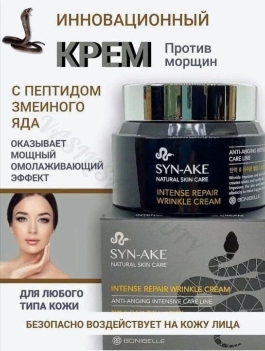 Syn-ake синтетический пептид, по своему действию похожий на действие яда храмовой гадюки Подобно тому, как парализуются мышцы человека после укуса змеи, пептид syn-ake блокирует нервные импульсы, благодаря чему мышцы лица не сокращаются, происходит их расслабление Молекулы syn-ake легко достигают нервно-мышечных окончаний и иммобилизуют сокращения мышц лица на 82 в течение 2 часов Благодаря такому действию пептида происходит выраженное разглаживание мимических складок вокруг рта, гусиных лапок в области глаз, носогубных складок и морщин на переносице Это приводит к постепенному разглаживанию мелких и средних мимических морщин, а также к уменьшению интенсивности глубоких Кроме того, крем со змеиным пептидом служит профилактикой появления новых морщин.