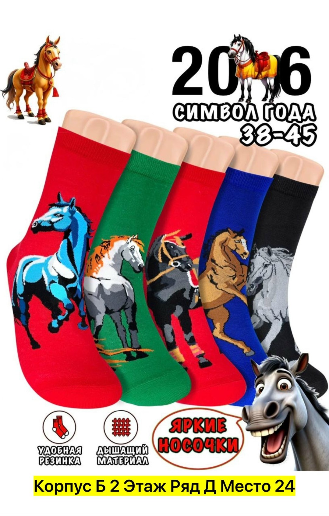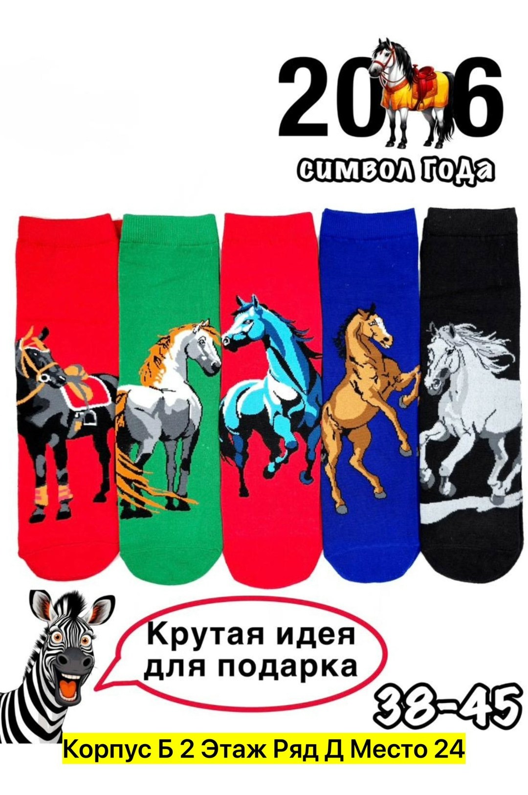 1 шт носки с лошадью размер с38 до45