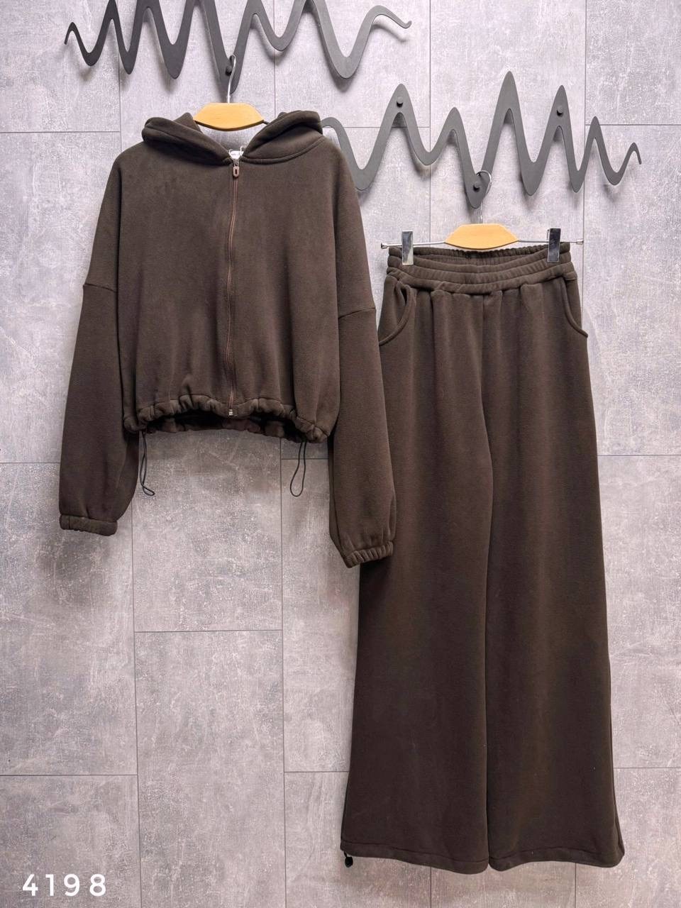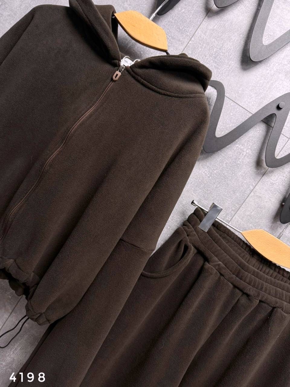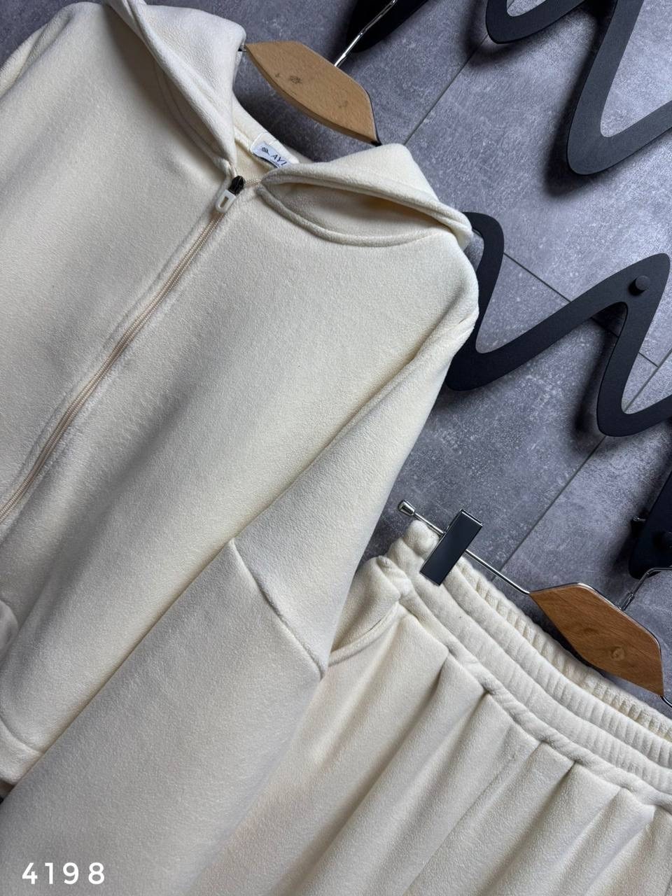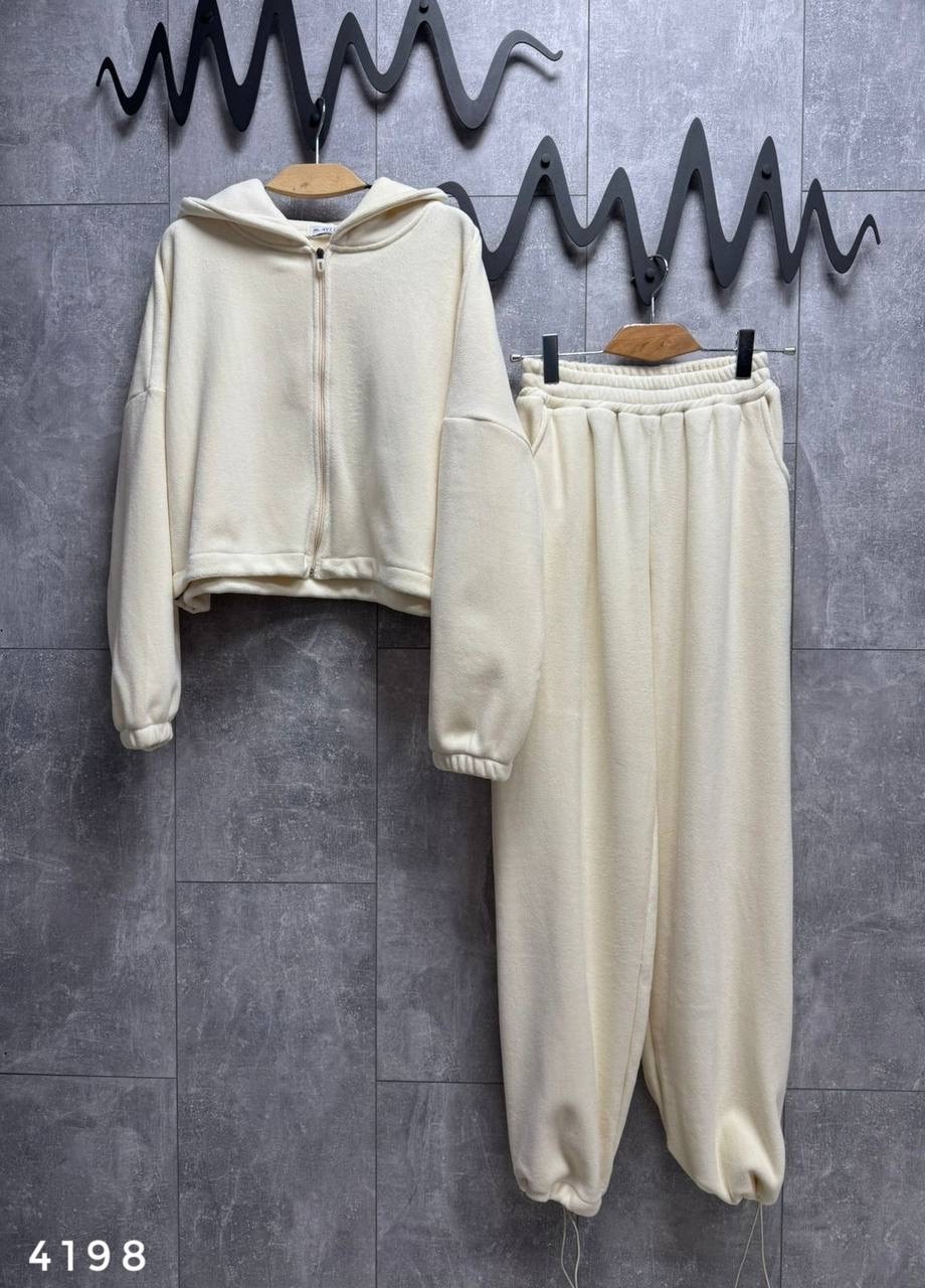Костюм - двойка плюшевая: олимпийка на молнии с капюшоном и кулиской по подолу брюки на резинке сверху и кулиска снизу Очень мягкие и приятные к телу Длина по внешнему шагу 109см / по внутреннему 72см Длина от плеча 48см / пог 67см Арт 4198.