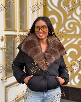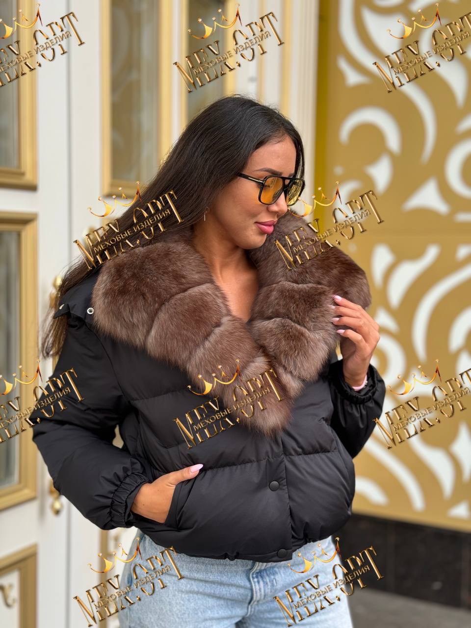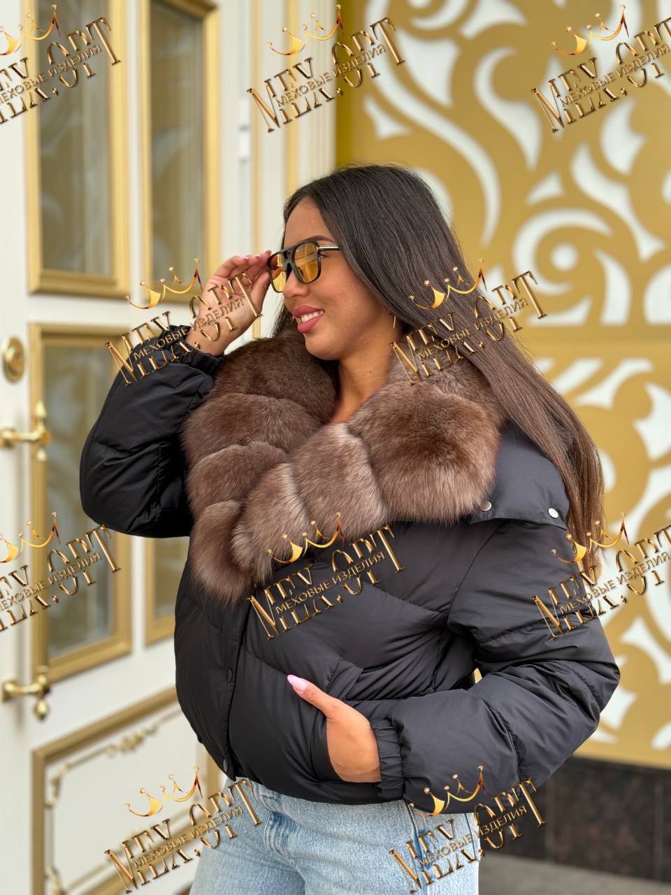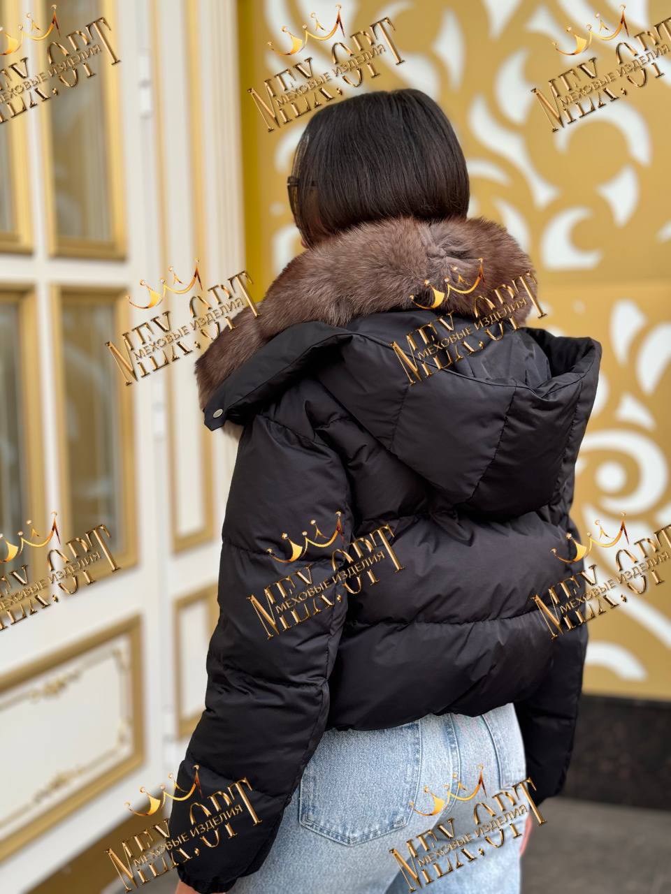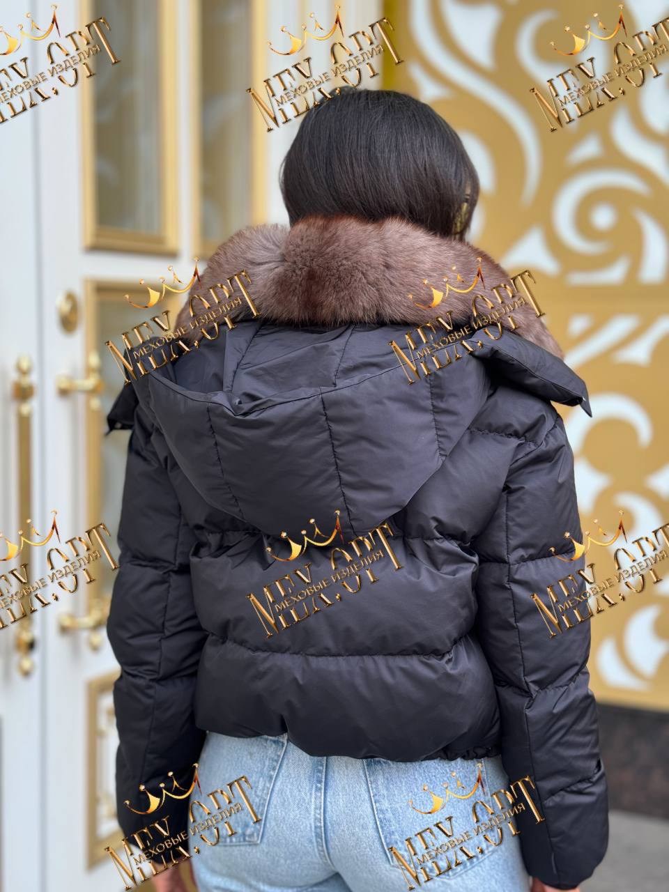 Пуховик с натуральным мехом песца с капюшоном, утеплен пухом, капюшон съемный, кулиска по низу, длина 50.