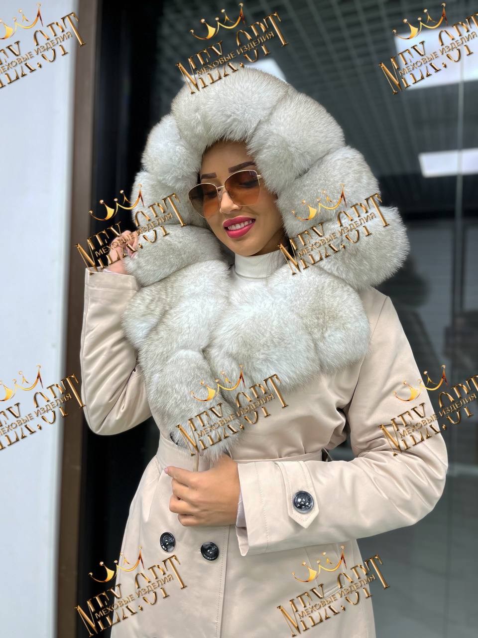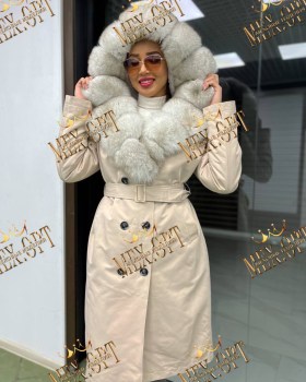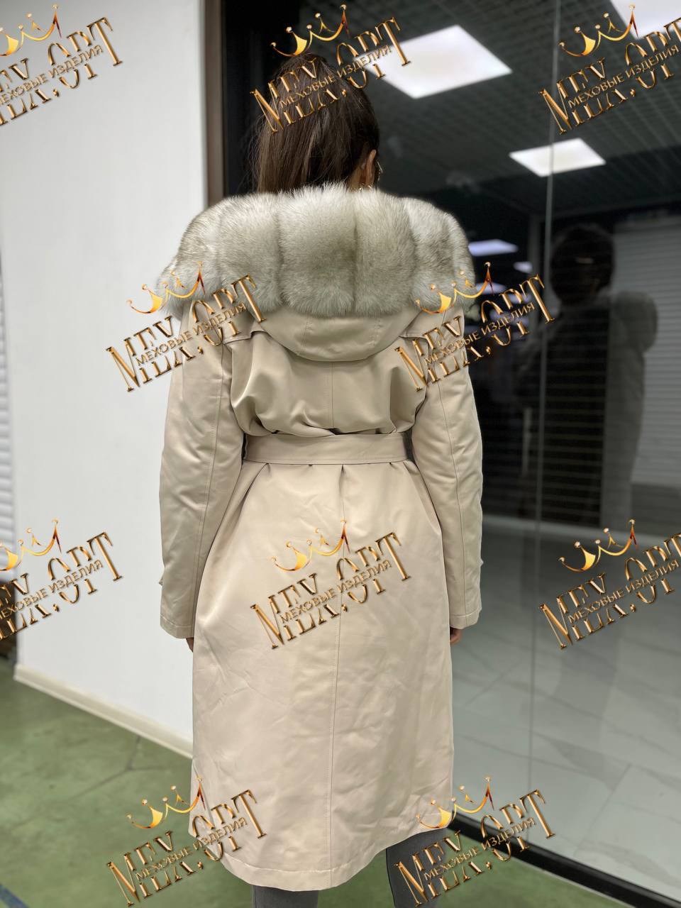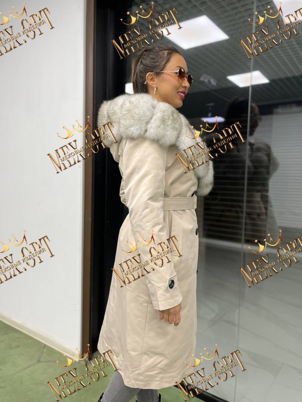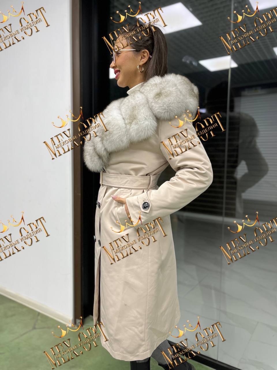 Тренч с натуральным мехом песца, длина 110 см, утеплен мехом бобрика и синтепоновой подстжкой.