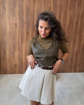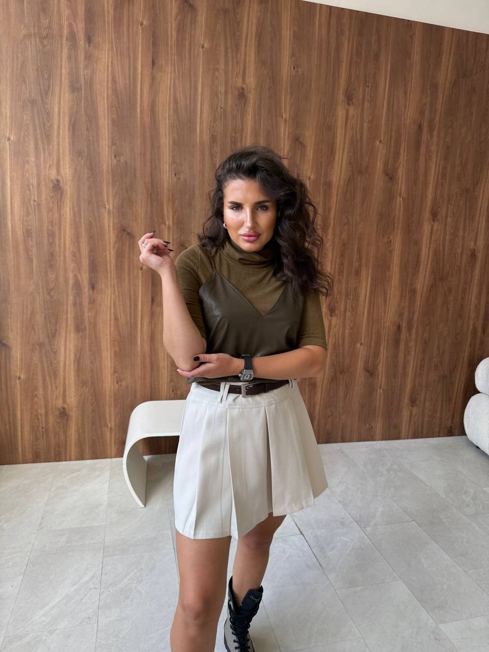 Американка-стильная и универсальная вещь, изюминку придает топ из эко-кожи.