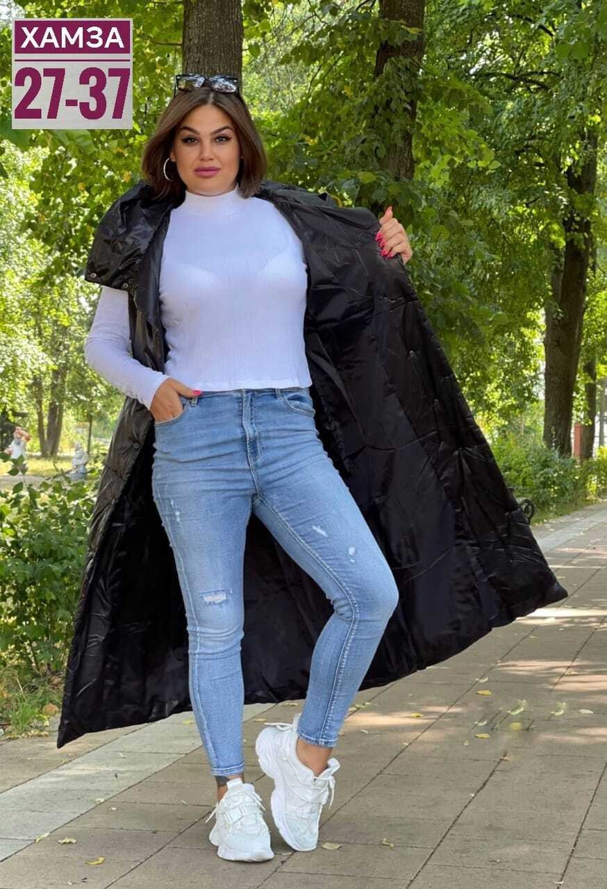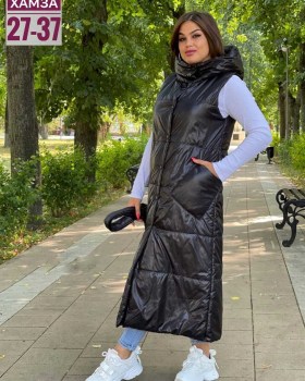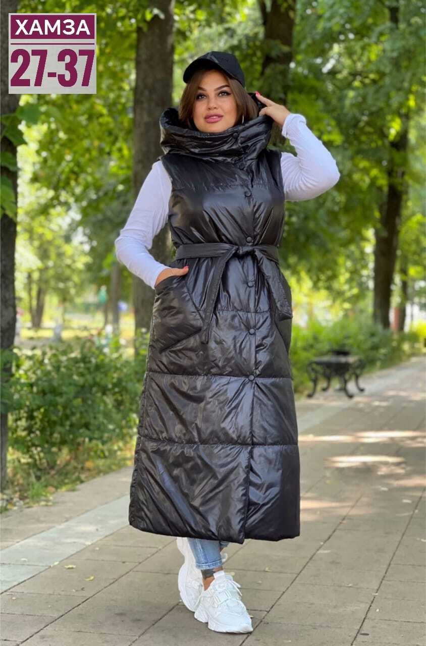 Удлиненная жилетка женская с капюшоном из плащевой ткань на синтепоне фабричная.