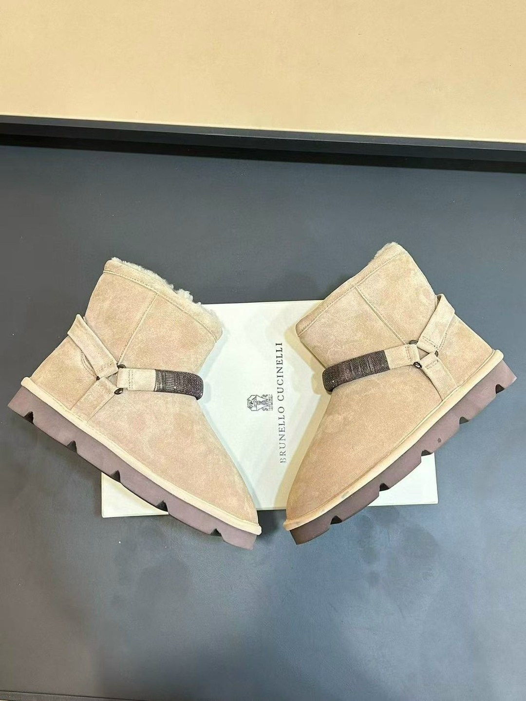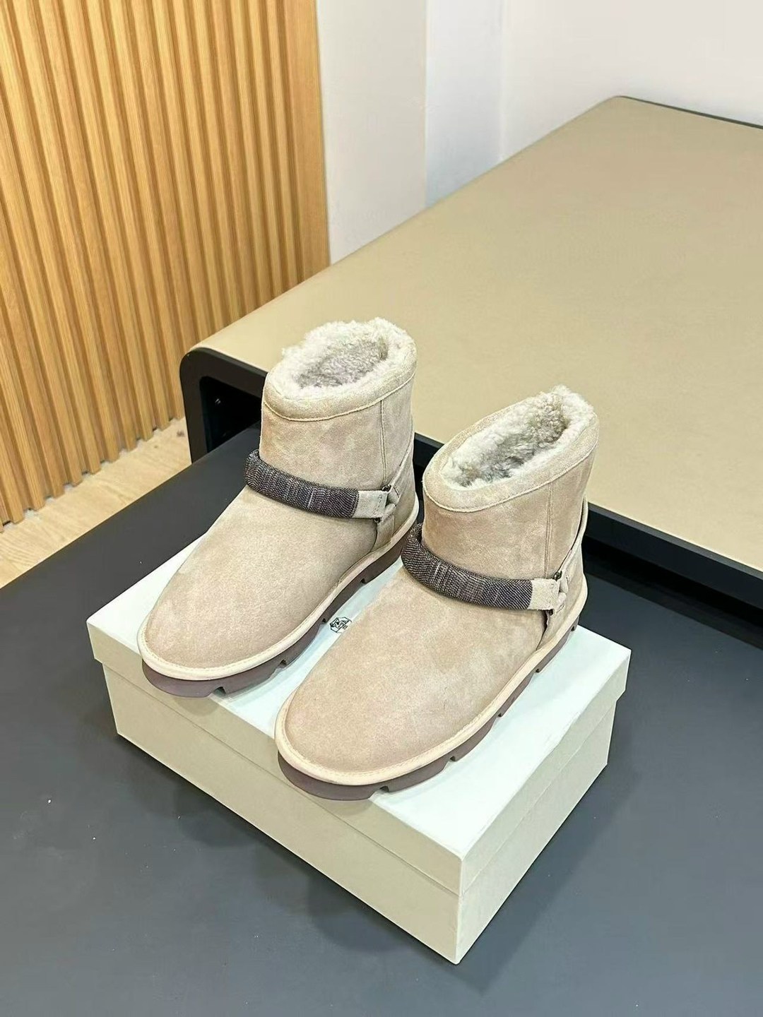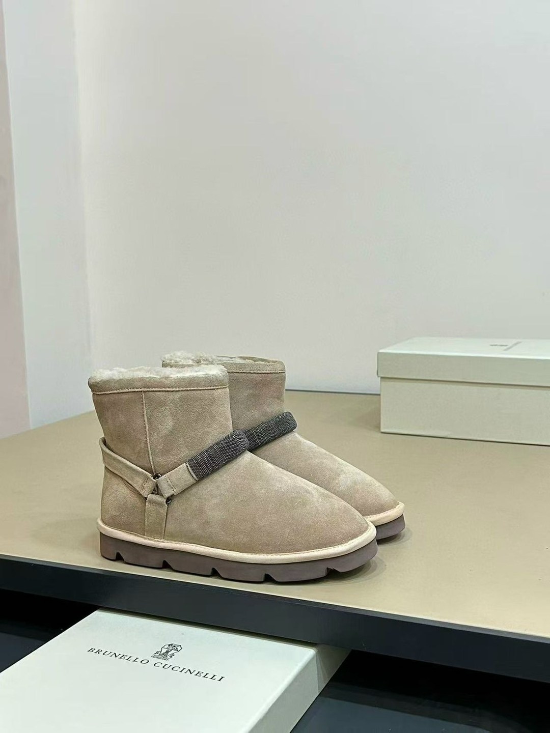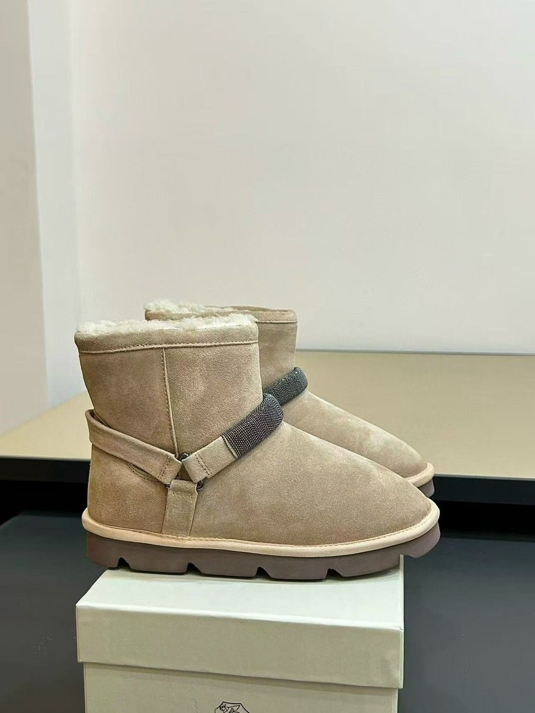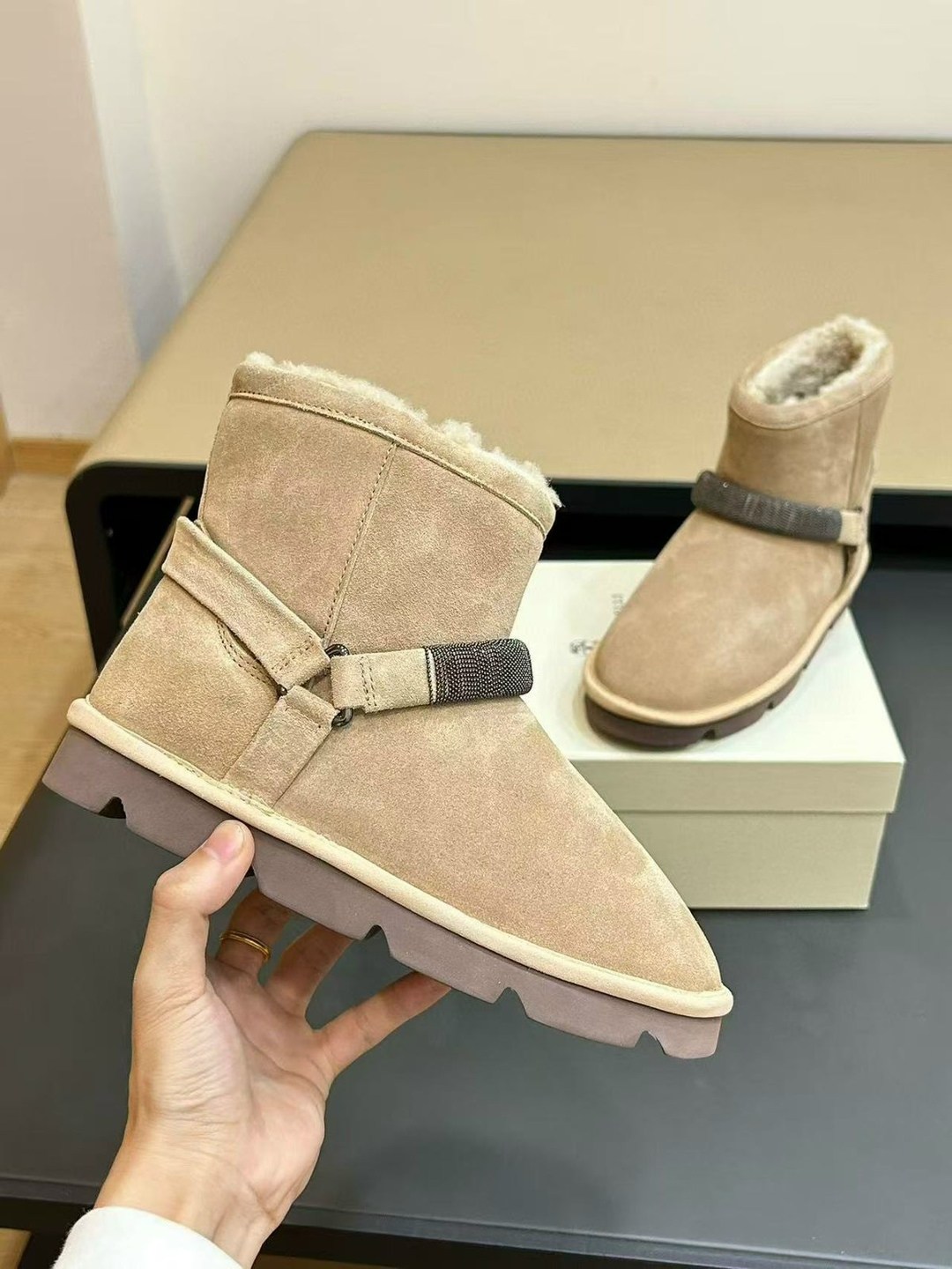 Зима new collection premium изысканные материалы и женственные детали определяют элегантный стиль этих новых замшевых сапог Мягкая, плотная кожа и подкладка из плюшевой овчины подчеркивают, что обувь идеально подходит для зимы Резинка спереди украшена вышивкой из тонких блестящих рядов монили, которая создает эффект ребристой текстуры.