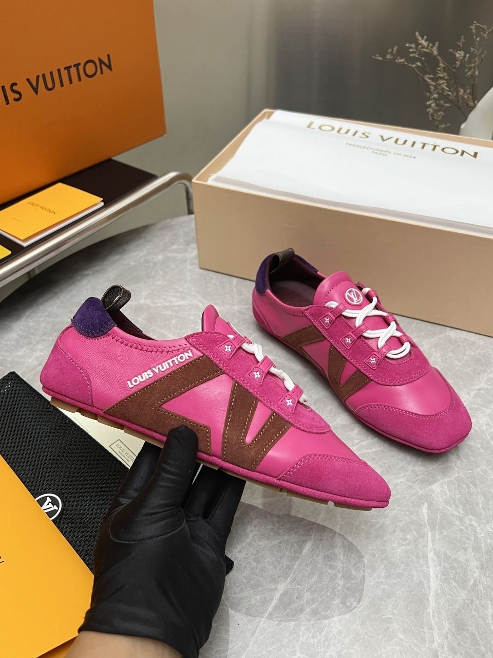 Louis vuitton new collection premium сникеры lv sneakerina из кожи ягннка великолепно дополнят стильный образ Инновационная модель на ультрагибкой подошве из тпу сочетает в себе комфорт сникеров и лгкость балеток Ключевыми особенностями дизайна служат отделка из замшевой кожи телнка, выразительные инициалы lv и петля из канвы monogram.