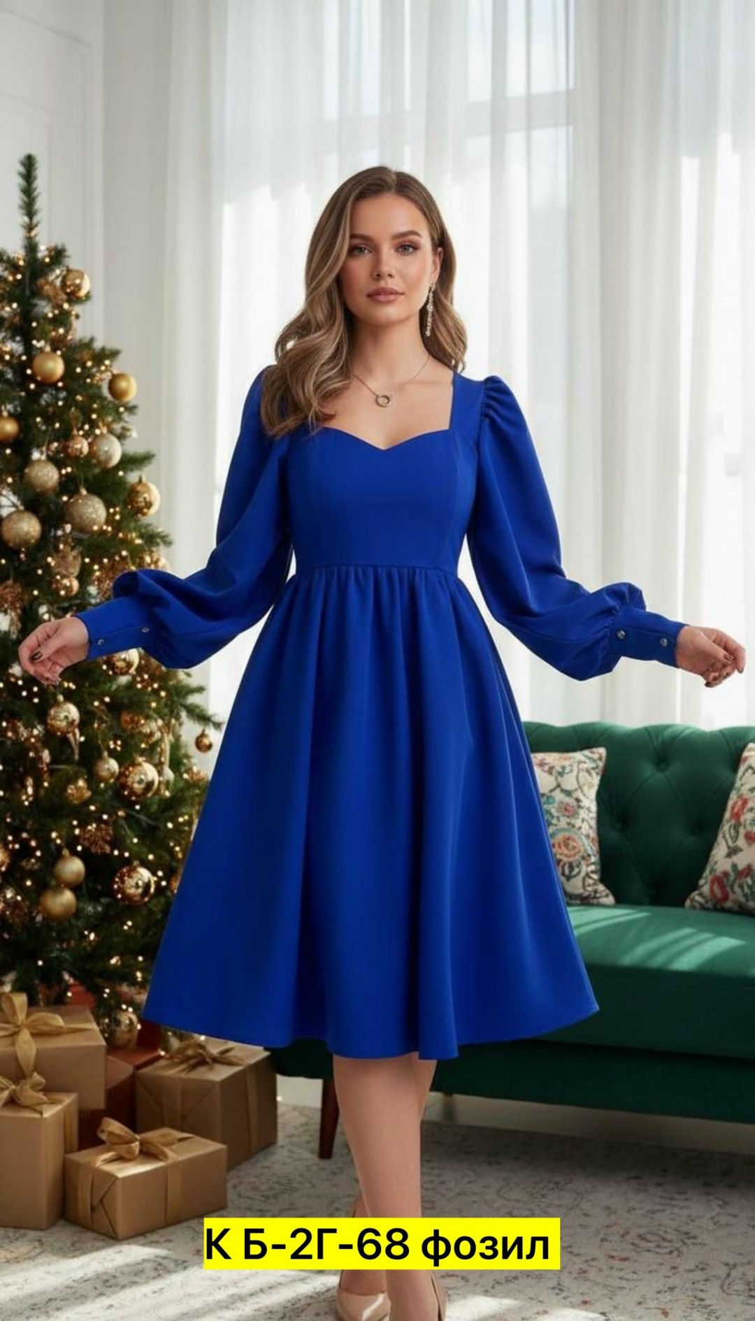 Акцентное платье с облегающим лифом, красивым декольте и узкими приподнятыми рукавами.