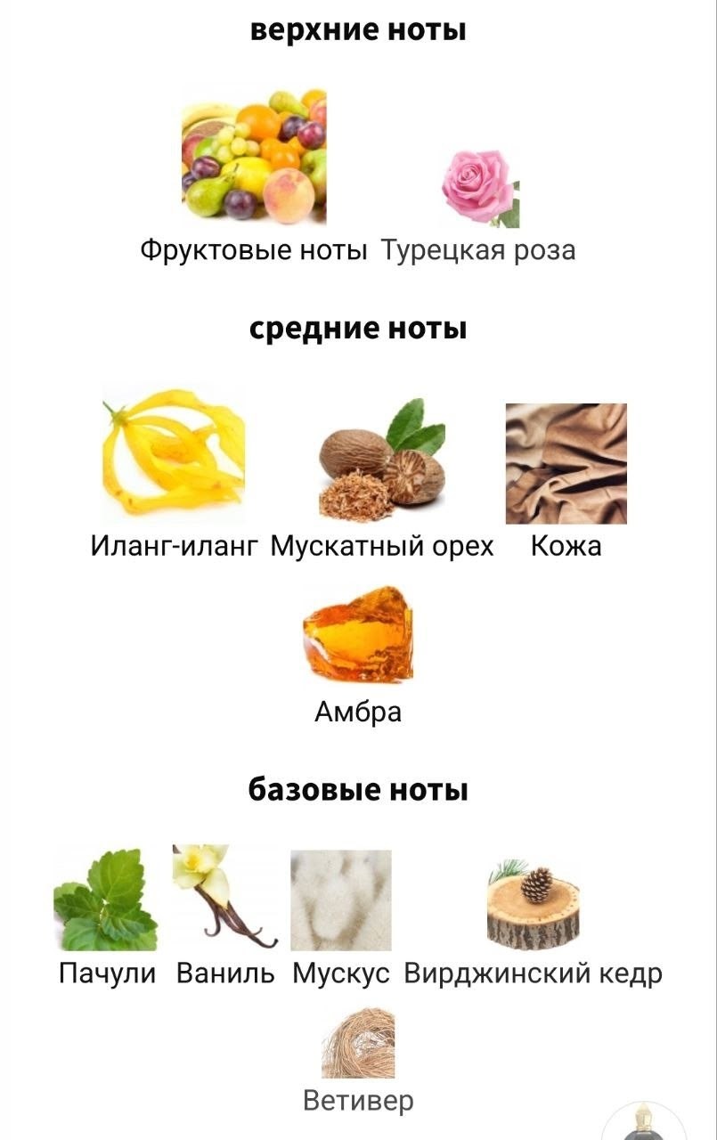 Верхние ноты: фруктовые ноты и турецкая роза;.