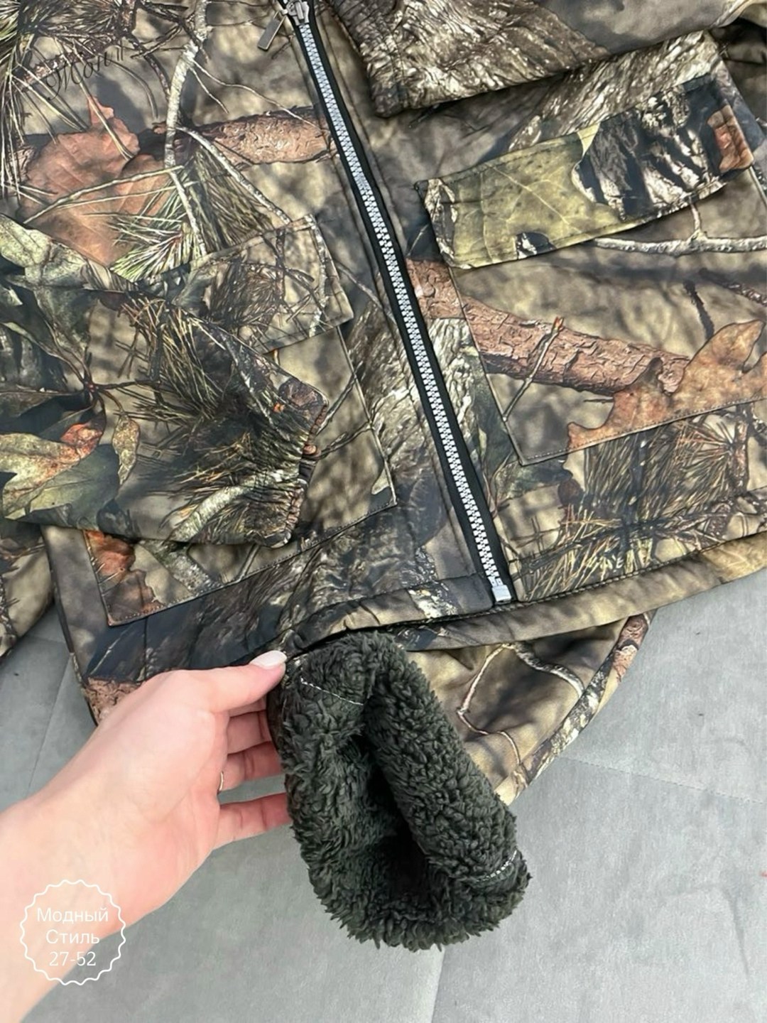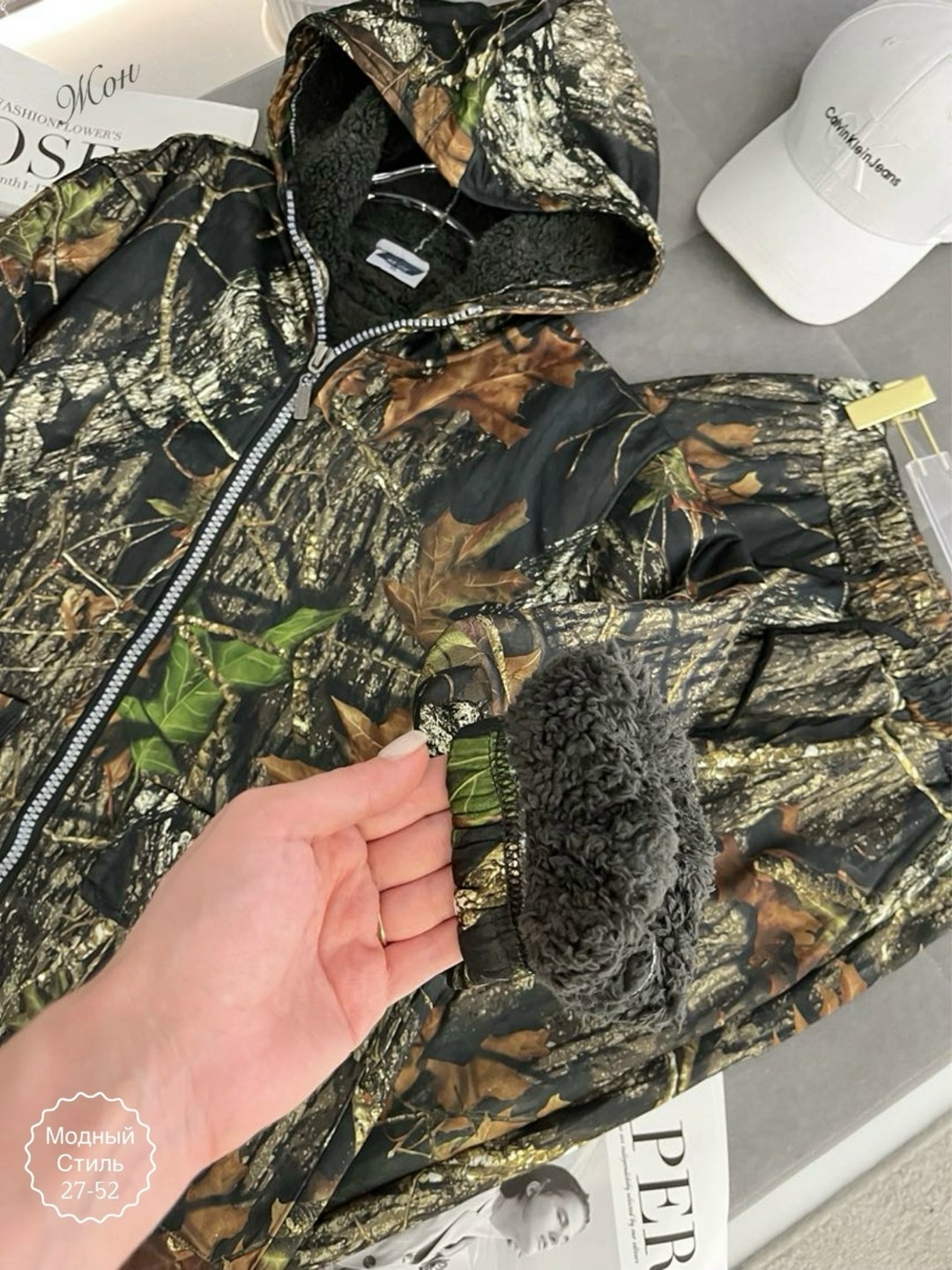 Снаружи - прочная плащевка с камуфляжным принтом, внутри - мягкий мех.
