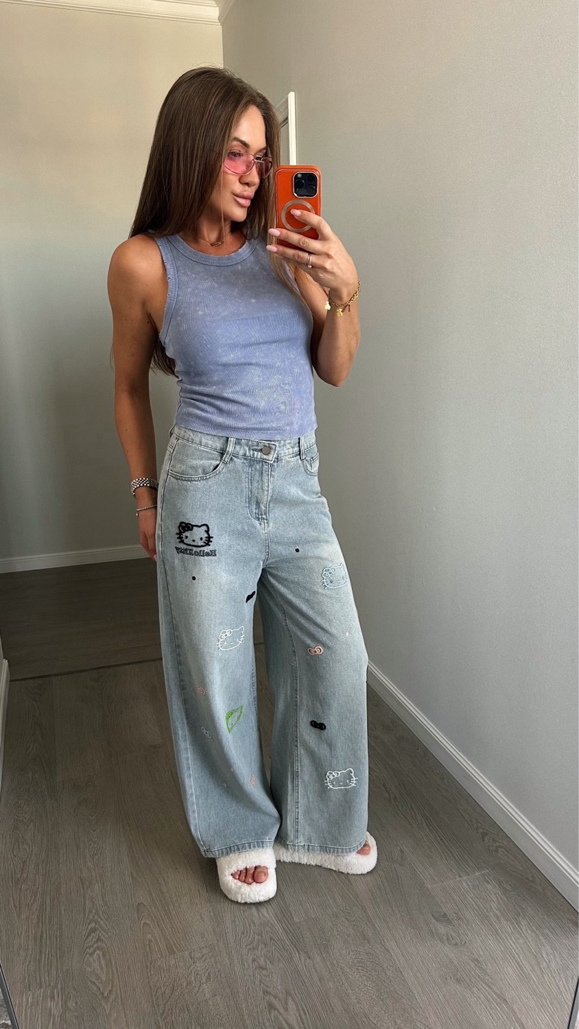 Классные джинсы свободного кроя с вышивками от hello kitty.