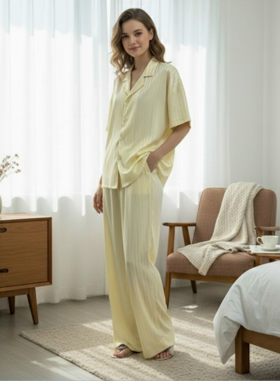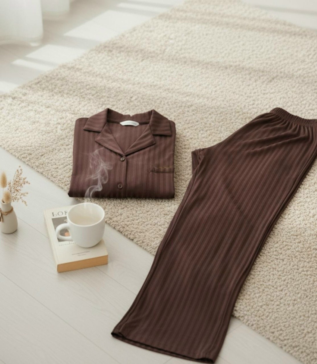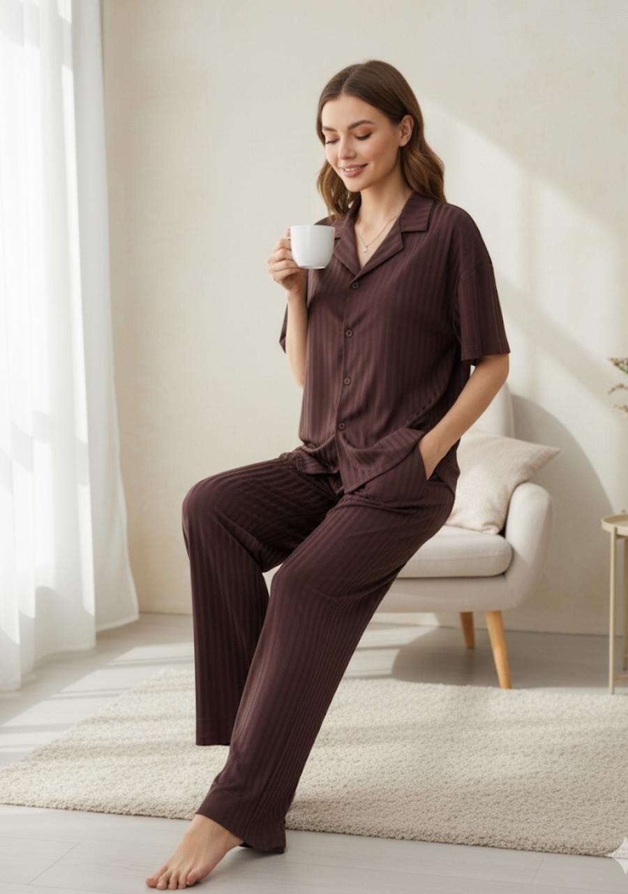 Вертикальная фактура тканьи визуально вытягивает силуэт, придавая образу элегантности даже дома.