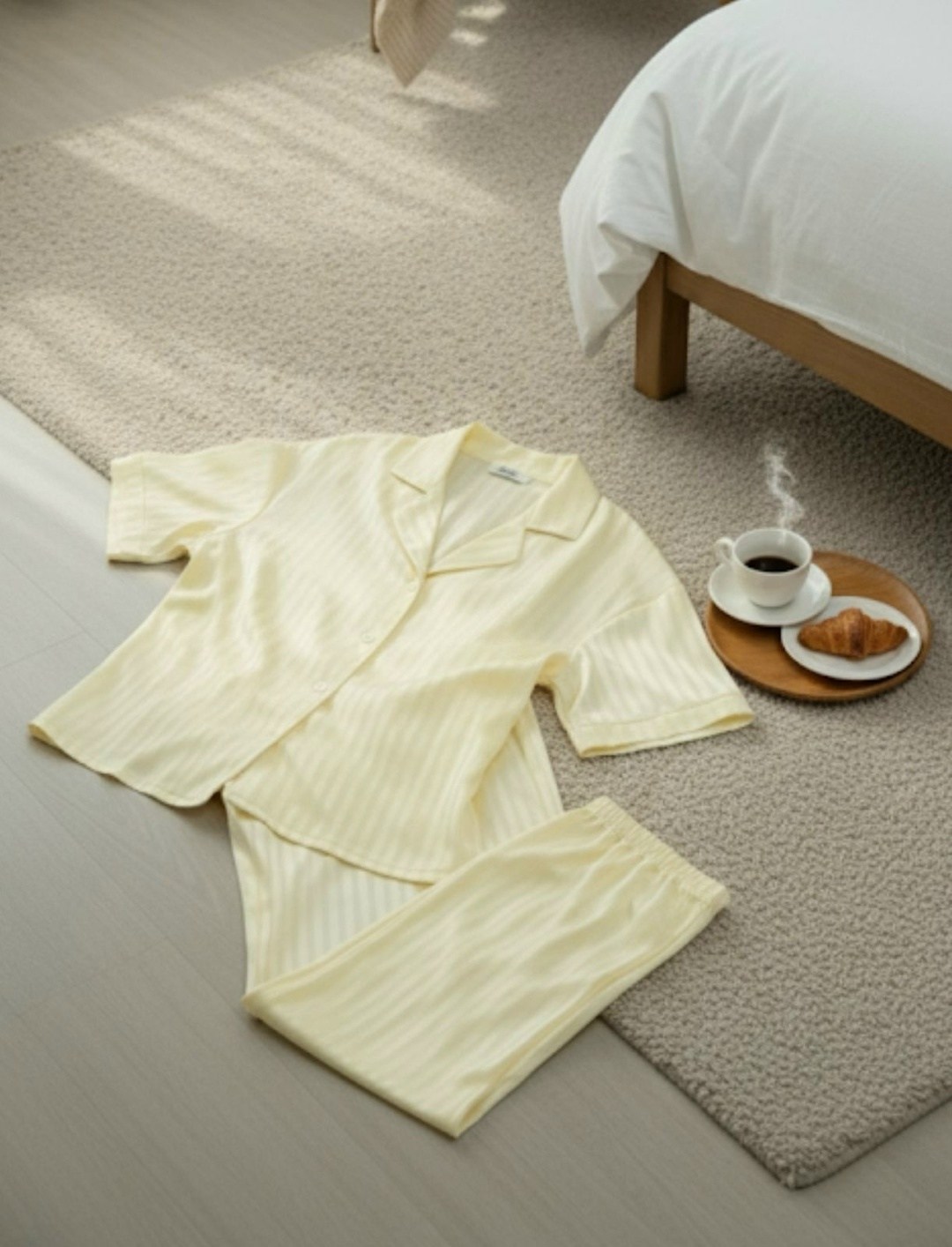 Мягкий шелковистый сатин струится по телу, лаская кожу и создавая ощущение лгкости и уюта Свободный крой, короткий рукав и широкие брюки дарят абсолютный комфорт для долгих утр, ленивых вечеров и спокойных снов.