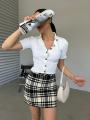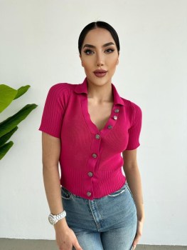 Клевая футболка с воротником и акцентыми серебристыми пуговицами.