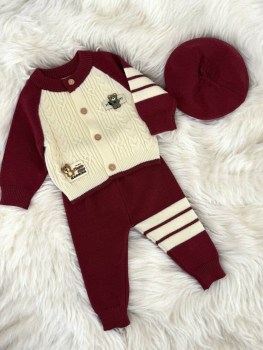 В набор входят: кофта с оригинальным вязаным узором и милым значком медвежонка, практичные брючки и беретик Мягкий и тплый трикотаж не раздражает кожу.