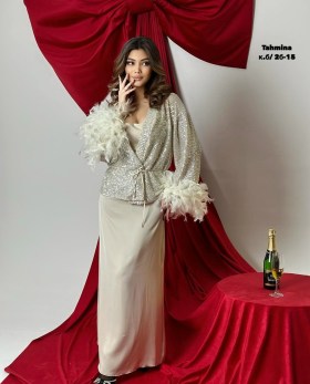 Представляем модные вечернее платье на бретелях с блестящим кардиганом длинными рукавами, которое подчеркнет достоинства вашей фигуры и привлечет внимание и все взгяды на вас!.