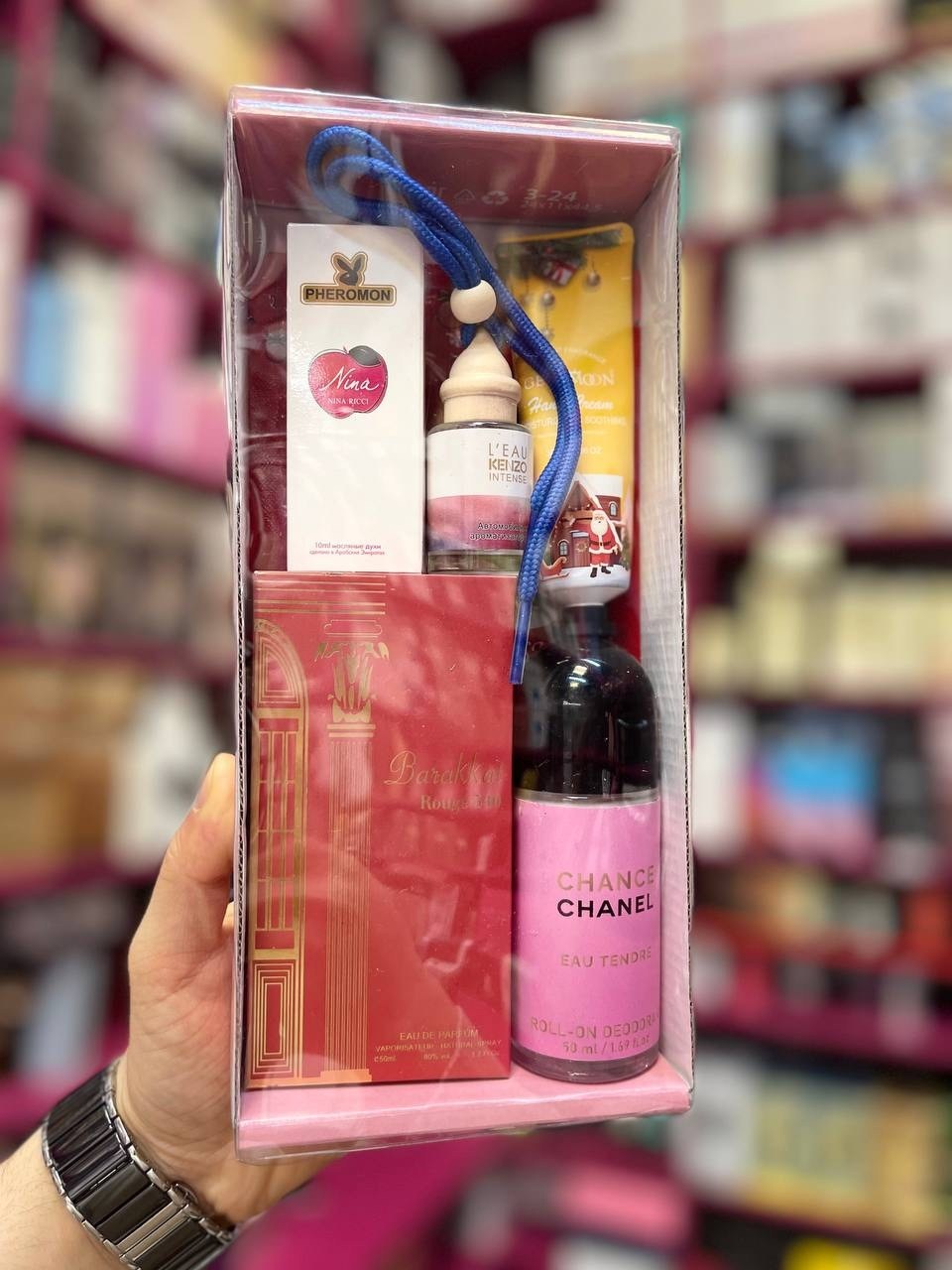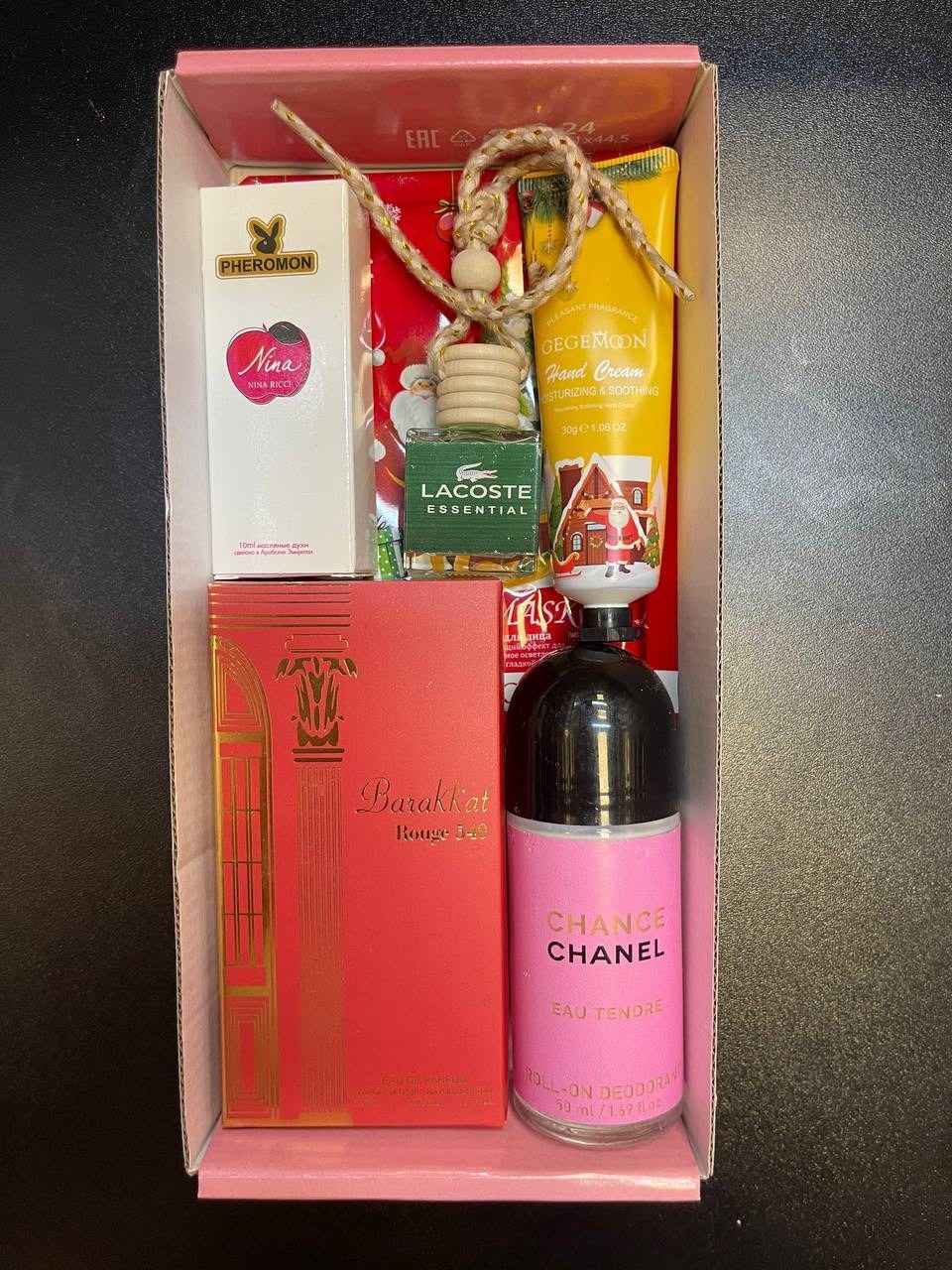 Состав: парфюмированный дезодорант, парфюм 50мл арабские ароматы, авто-парфюм, мини-парфюм 10мл, крем для рук.