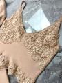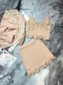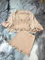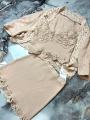 Нежный комплект в пудровом тоне, украшенный изысканным кружевом Топ с глубоким вырезом и легкая накидка создают утончнный, романтичный образ, а мини-юбка с кружевной отделкой добавляет современной элегантности и изящества.