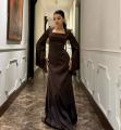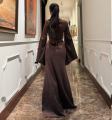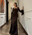 Шлковистое вечернее платье с приталенным силуэтом, квадратным вырезом и выразительными расклшенными рукавами, украшенными мини-жемчужинами по краю Сидит элегантно, подчркивает талию и создат роскошный вытянутый силуэт.