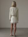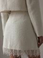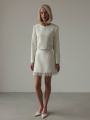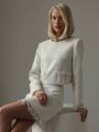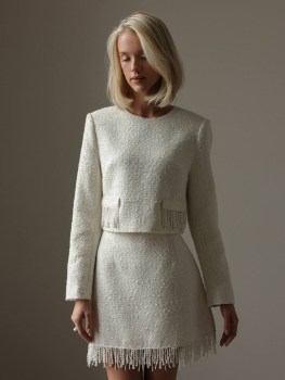 Твидовый костюм-двойка в элегантном и женственной вариации: жакет мини-юбка в нежном молочном цвете.