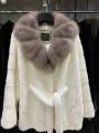 Шубка из меха европейской норки (под импорт), английский воротник из меха куницы, модель кимоно, длина 75 см, цвет белый жемчуг.