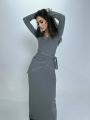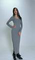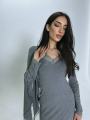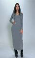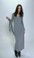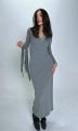 Стильное серое платье макси длины с утонченным кружевным декором на вырезе и манжетах, дополненное легким платком, который нежно обрамляет лицо Этот образ сочетает в себе элегантность и комфорт, идеально подходит для уютных вечерних прогулок и изысканных событий.