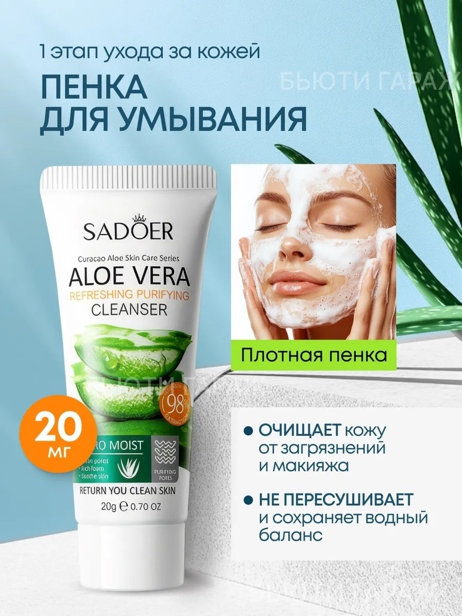 1) очищающая пенка для умывания sadoer с соком алоэ вера (100 г) мягко удаляет загрязнения, подготавливает кожу к дальнейшему уходу, увлажняет и насыщает полезными микроэлементами.