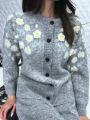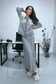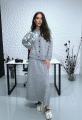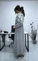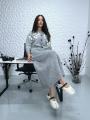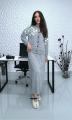 Женский комплект из мягкого трикотажа светло-серого цвета включает в себя кардиган и длинную юбку Кардиган украшен белыми цветочными аппликациями на плечах и имеет ряд крупных тмных пуговиц по центру Юбка прямая, макси длины, из того же материала Костюм выглядит комфортно, стильно и подходит для холодной погоды.