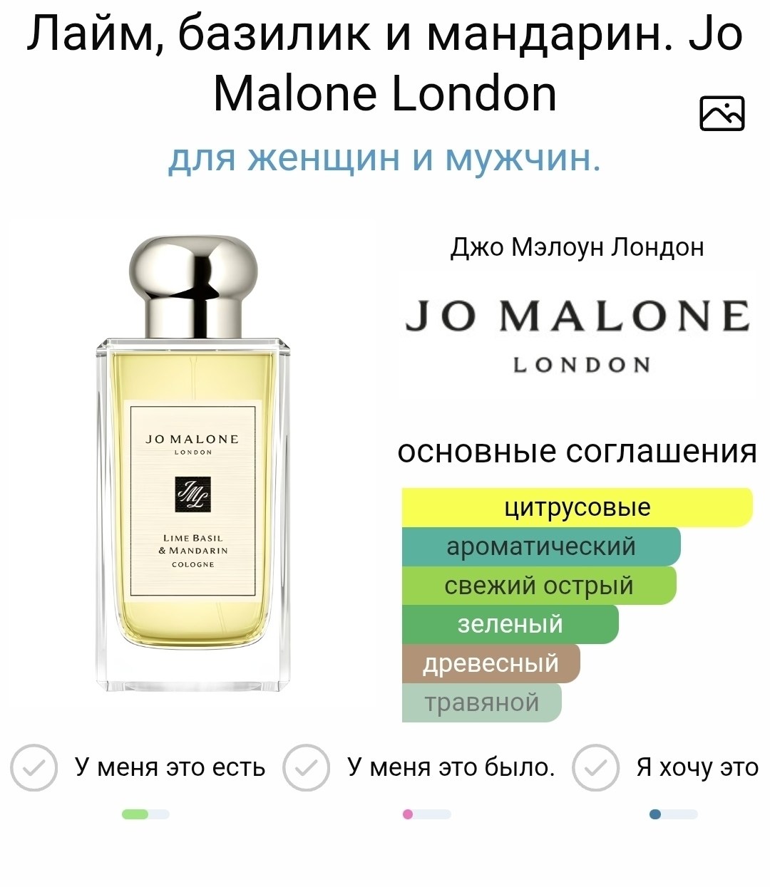 Lime basil mandarinотjo malone london это цитрусово-ароматический аромат для женщин и мужчин lime basil mandarinбыл выпущен в 1999 году Парфюмер, создавший этот аромат, джо малоун Верхние ноты: лайм, мандарин и бергамот; средние ноты: базилик, тимьян, сирень и ирис; базовые ноты: ветивер и пачули.