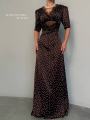 Это стильное платье миди с v-образным вырезом и короткими рукавами станет идеальным выбором для вечерних мероприятий, новогодних праздников или офисного дресс-кода.