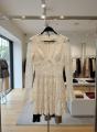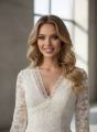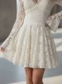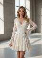 Нежное кружевное платье с v-образным вырезом и расклешнными рукавами, подчркивающее фигуру и придающее образу романтичную легкость и изящество.