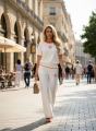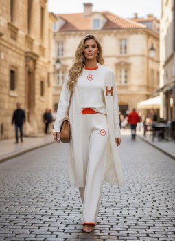 Изысканный белый брендовый костюм с яркими оранжевыми деталями гармония комфорта и элегантности Свободные брюки и стильный топ идеально сочетаются с длинным кардиганом, создавая утончнный образ для городских прогулок и повседневной жизни Акцент на контрастной отделке придат наряду свежесть и индивидуальность.