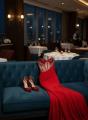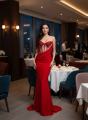Красное длинное платье с полупрозрачным корсетом и пайетками, без бретелей, элегантное и эффектное.