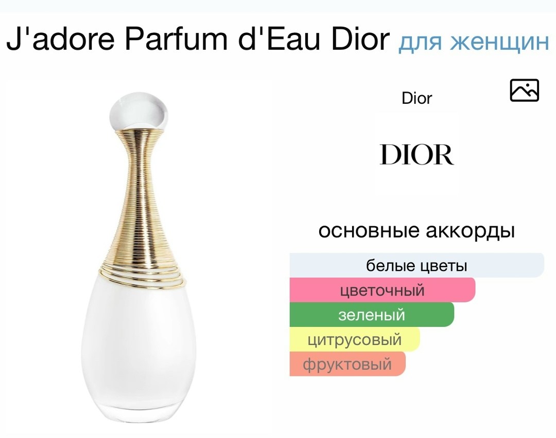 Christian dior jadore parfum deau восхитительный и утонченный женский цветочный аромат, выпущенный в 2022 году знаменитым брендом christian dior Это бесспиртовой цветочный фланкер женского аромата jadore 1999 года Это смесь воды и цветов, заново раскрывающая обещание удовольствия, которое jadore поддерживает с 1999 года.
