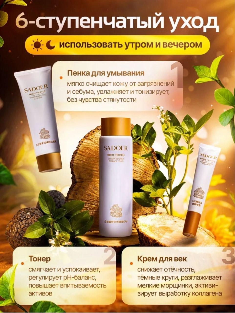 Гиалуроновая кислота знаменита способностью глубоко увлажнять и создавать барьер от потери влаги на поверхности кожи В состав уходового набора входят 6 средств Очищающая пенка для лица глубоко очищает, регулирует работу сальных желез Тоник возвращает здоровое сияние кожи Увлажняющая эссенция удерживает влагу и укрепляет кожу, делая ее более шелковистой Ночная маска питает, успокаивает, увлажняет и разглаживает Крем для кожи вокруг глаз восстанавливает, напитывает и осветляет кожу За счет увлажнения эффективно наполняет влагой, разглаживая заломы Питательный крем делает кожу эластичной и подтянутой.