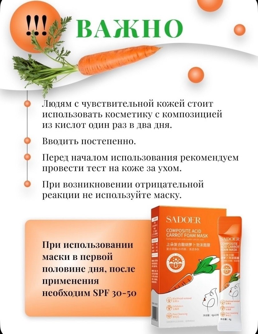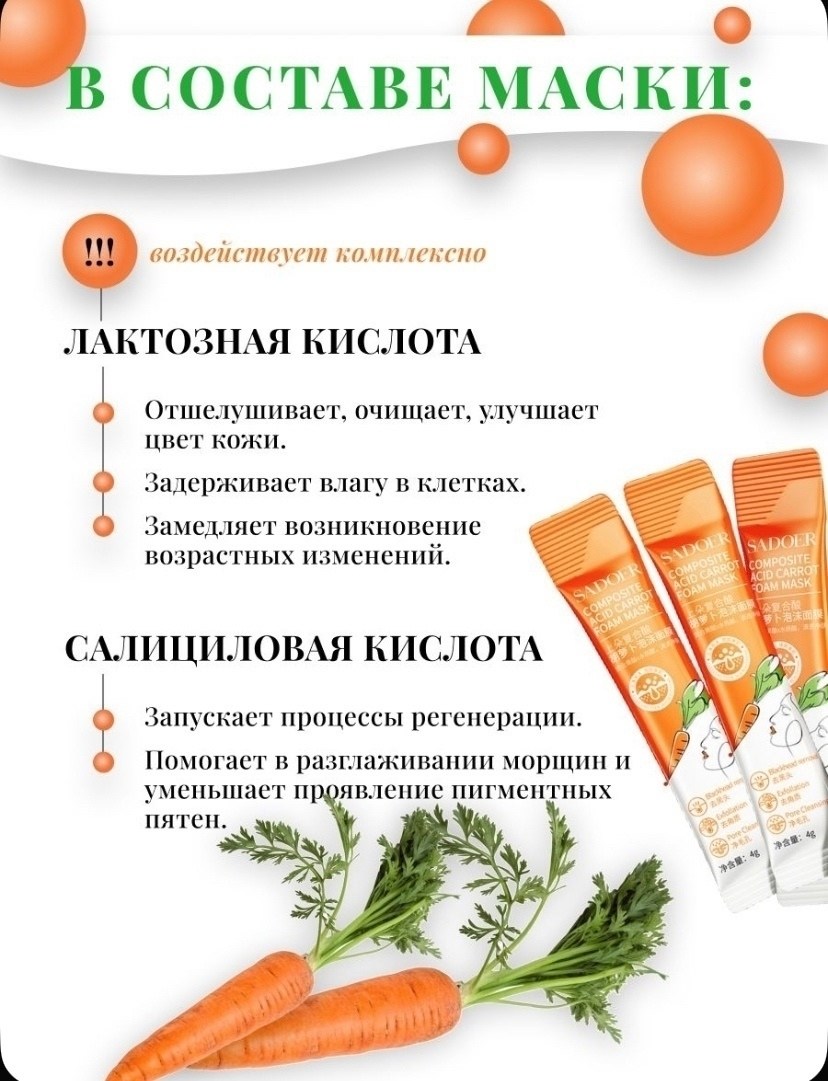 Уникальная формула маски включает в себя экстракт моркови, который обладает выраженными питательными и увлажняющими свойствами Морковный экстракт обогащает кожу витаминами и антиоксидантами, стимулирует процессы регенерации и улучшает общий тон кожи Комплекс кислот эффективно отшелушивает ороговевшие клетки, улучшая текстуру кожи и делая е более гладкой и однородной.