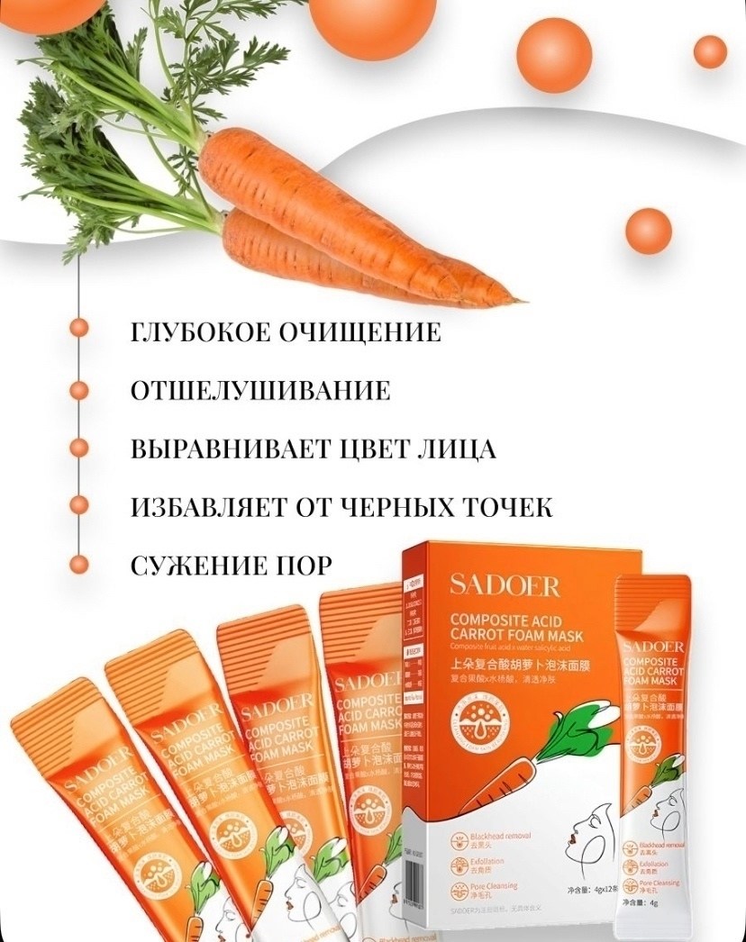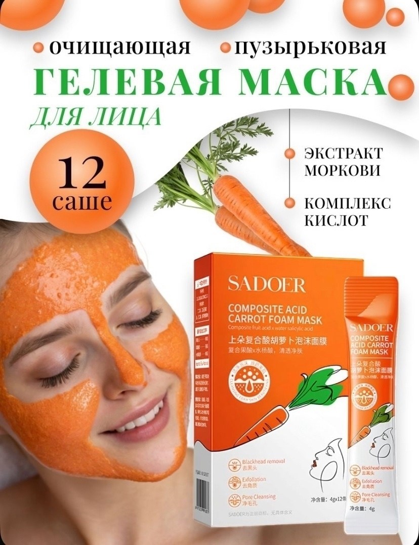 Представляем очищающую маску для лица с эффектом пузырьков, обогащенную экстрактом моркови и комплексом кислот Этот продукт является инновационным средством для профессионального ухода за кожей Маска предназначена для глубокого очищения и интенсивного обновления эпидермиса, что способствует достижению здорового и сияющего внешнего вида кожи.