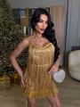 Эффектное платье на тонких бретелях с выразительной отделкой из длинной бахромы.