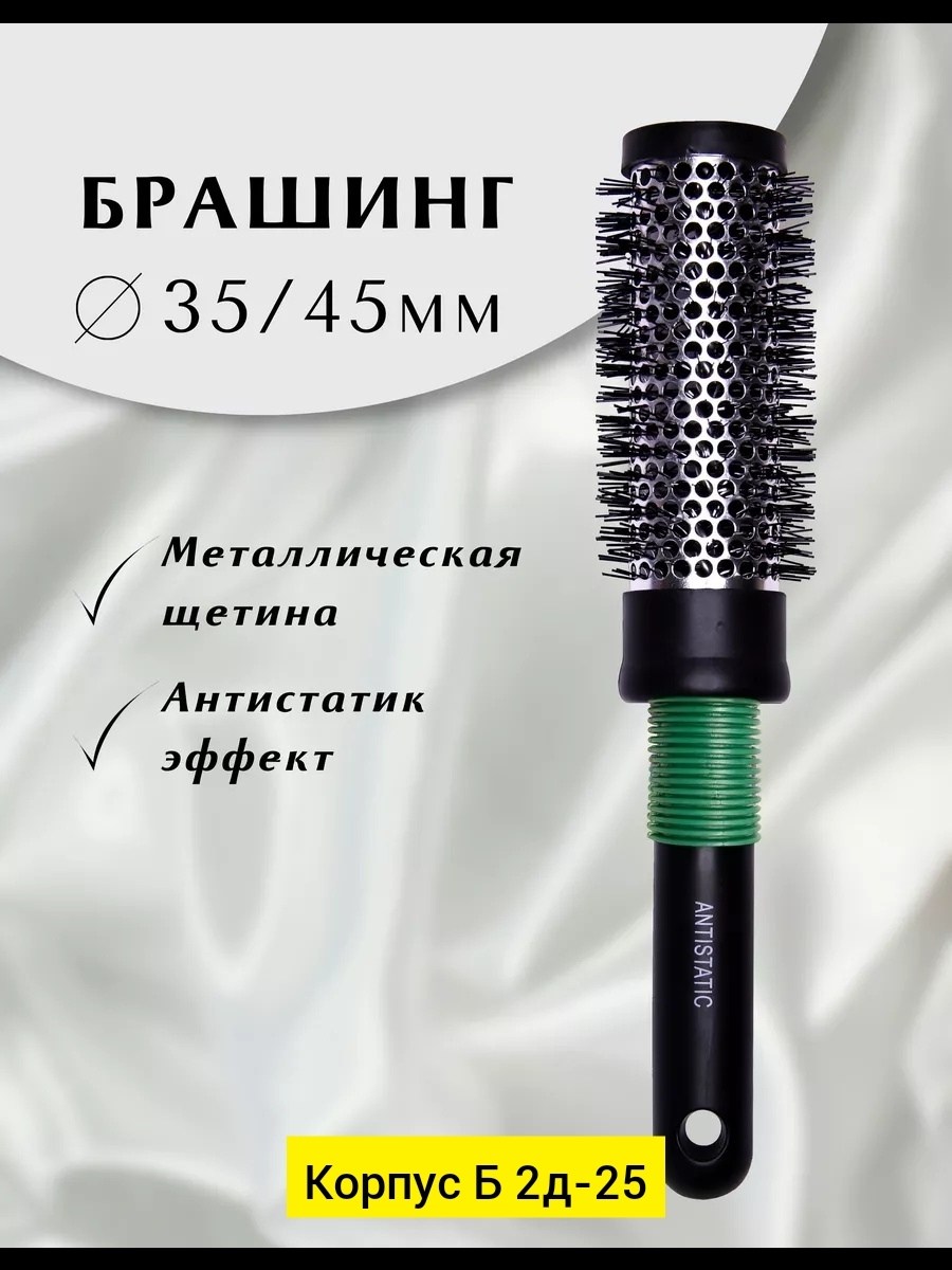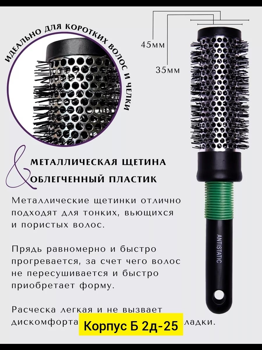 Профессиональная круглая расческа для укладки волос феном брашинг 35мм/45мм (3,5см/4,5см) со сквозными отверстиями Данный диаметр подойдет для средних и коротких волос, а также для укладки челки В конструкции расчески используется металлическая щетина- идеально для тонких пористых волнистых волос,.