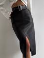Длинная юбка миди с разрезом привлекает внимание своей красотой и изяществом.