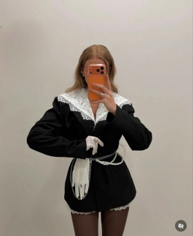 Классический пиджак с изысканным капюшоном из гипюра.