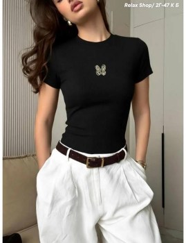 Футболка по фигуре в вышивкой в виде бабочки подходит на любой тип фигуры.