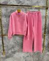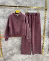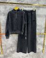 Демисезонный комплект состоит из кофты с высоким горлом и полузамком, а также широких штанов.
