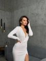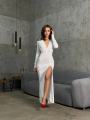 Модное вечерное обтягивающие платье с выразительным декольте, акцентным вырезом и высоким разрезом подчркивает фигуру.