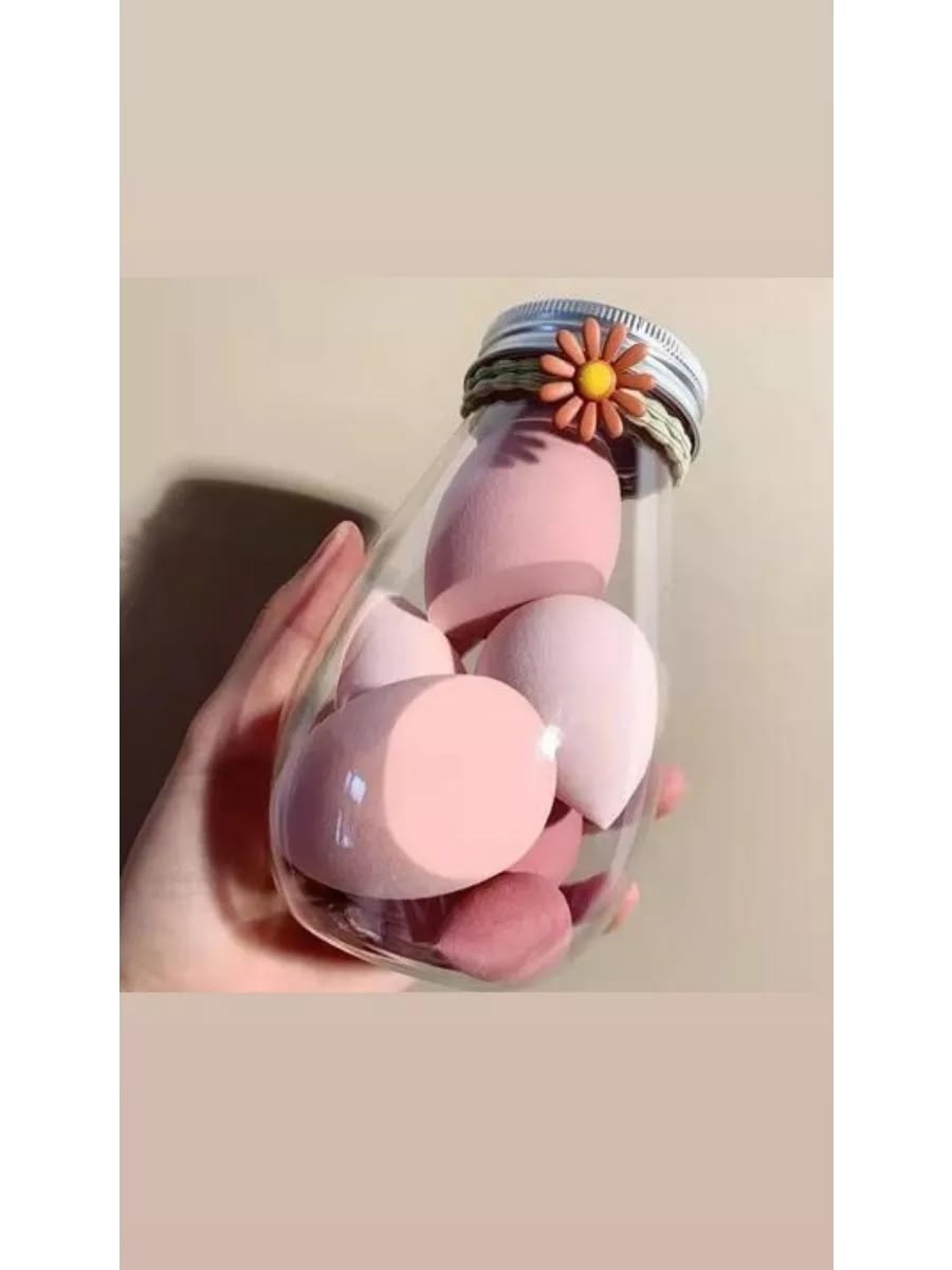 Комплектация шесть спонжей разных размеров; пластиковая банка для хранения; декоративная резинка; упаковочный пластиковый пакет; 6 шт.